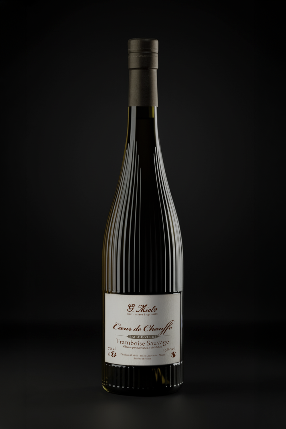 Pour la Distillerie G. Miclo, maison emblématique d'Alsace, j'ai repensé de A à Z le design de la bouteille Cœur de Chauffe — leur eau-de-vie haut de gamme. Le brief était clair : donner à ce produit d'exception ses lettres de noblesse, le rendre immédiatement premium aux yeux du consommateur, et le distinguer radicalement dans un univers de spiritueux très concurrentiel.